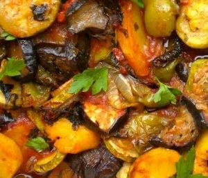 1 κιλό πατάτες κομμένες σε ροδέλες 4-5 κολοκυθάκια σε ροδέλες 4-5 μελιτζάνες σε σε ροδέλες 2-3 καρότα σε ροδέλες 2 ντομάτες σε ροδέλες 2 πιπεριές κόκκινες (ή πράσινες) 1 φλιτζάνι χυμό ντομάτας 1/2 λεμόνι σε φέτες (προαιρετικά) 2 σκελίδες σκόρδο πολτοποιημένο 3/4 φλιτζανιού ελαιόλαδο 1/2 ματσάκι μαϊντανό Πιπέρι μαύρο, πιπέρι γλυκό κόκκινο, αλάτι, ρίγανη