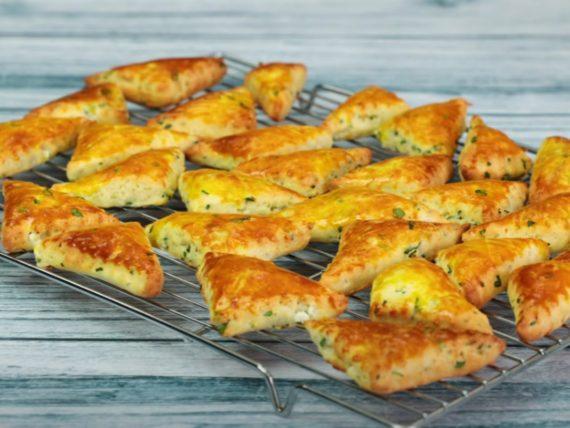 Συνταγή για Τρίγωνα τυροπιτάκια στο φούρνο. Αφράτα τρίγωνα τυροπιτάκια στο φούρνο με φέτα και κίτρινο τυρί με σπιτική ζύμη χωρίς φύλλο κρούστας, έτοιμα γρήγορα για το παιδικό πάρτι ή το σχολείο.