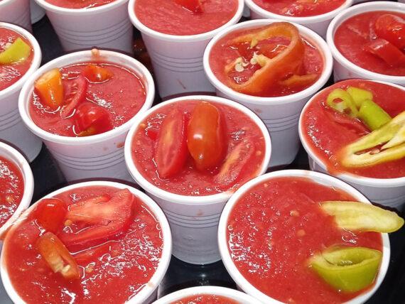 Μοιράζουμε τον πολτό σε πλαστικά κυπελάκια και βάζουμε σε κάθε κυπελάκι από λίγες πιπεριές χωρίς τα σπόρια τους και λίγα ντοματίνια κομμένα στη μέση. Βάζουμε τα κυπελάκια στην κατάψυξη και τα χρησιμοποιούμε όποτε θέλουμε.