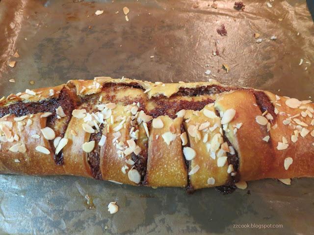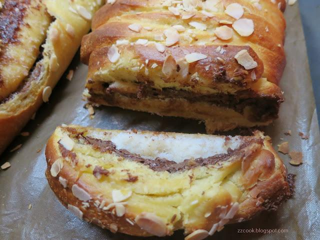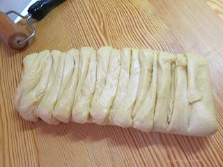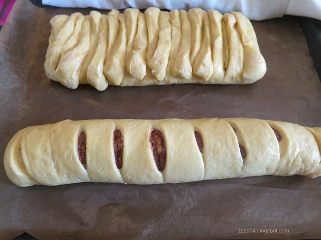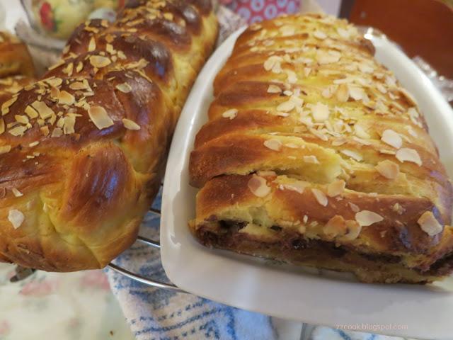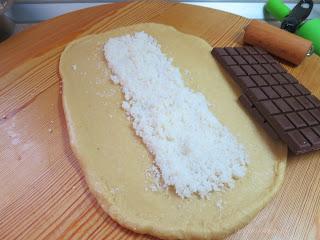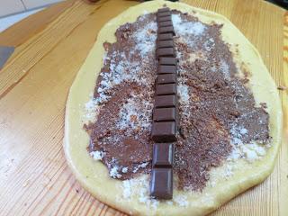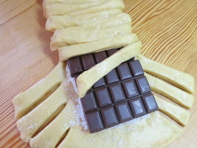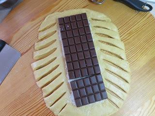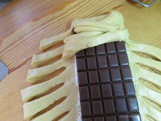 Απλώνουμε εκεί που θα μπει η σοκολάτα απλώνουμε την πάστα και επάνω τοποθετούμε τη σοκολάτα. Κόβουμε όπως φαίνεται στη φωτογραφία, διπλώνουμε και πλέκουμε, δεν ξεχνάμε να βάλουμε το δεύτερο τελείωμα μέσα στο πλέξιμο.