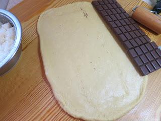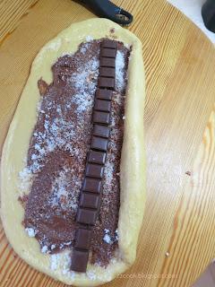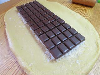 Παίρνουμε το ζυμάρι με προσοχή …κολλάει λίγο αλλά με τα χέρια λίγο αλευρωμένα ;όλα πάνε καλά… …αν είναι απο το ψυγείο δε…ανοίγει υπέροχα!!! Κάνουμε ένα παραλληλόγραμμο στο φάρδος όσο τρεις σοκολάτες και σε πλάτος όσο δύο. Στο σημείο αυτό βάζουμε τη ζύμη στο ψυγείο για 15 λεπτά για να δουλεύετε καλύτερα.