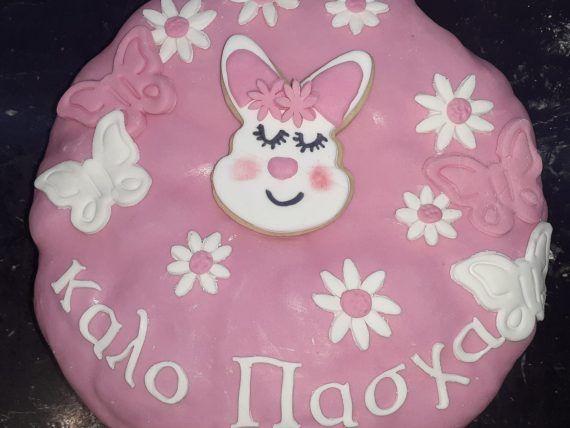 Βάζουμε περιμετρικά στο τσουρέκι, αλλά και στην πάνω μεριά κόλλα ζαχαροπλαστικής. Ρίχνουμε στην επιφάνεια εργασίας μας νισεστέ, ώστε να μην κολλάει η ζαχαρόπαστα και ανοίγουμε σε φύλλο τη ροζ ζαχαρόπαστα με τη βοήθεια του πλάστη. Την τοποθετούμε προσεκτικά πάνω στο τσουρέκι και την κολλάμε πιέζοντας απαλά με τα χέρια μας.