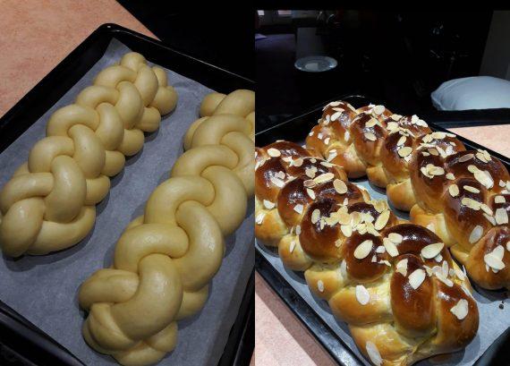 Ζυμώνουμε καλά μέχρι να πάρουμε μία λεία ζύμη που δεν θα κολλάει στα χέρια. Το ζύμωμα θα μας πάρει περίπου 10 λεπτά. Αφού η ζύμη είναι έτοιμη, την αφήνουμε να διπλασιαστεί. Τα πλάθουμε με 4 και 6 κορδόνια ή με όποιον τρόπο μας είναι πιο εύκολος.