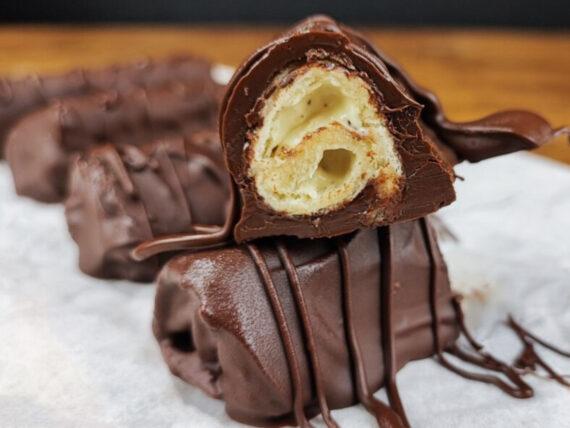 Λιώσε την κουβερτούρα σε μπεν μαρί και βούτα μέσα σε αυτήν τα ρολάκια ψωμιού. Βάλε στην κατάψυξη για 1 ώρα και απόλαυσε. Μπορείς να τα διατηρήσεις τέλεια στο ψυγείο αφού τα αφήσεις πρώτα 1 ώρα στην κατάψυξη.