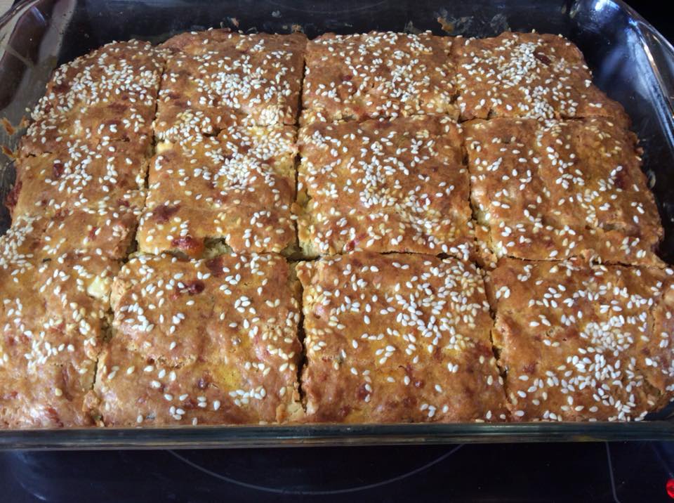 Χτυπησα τα αυγα μεσα στο γιαουρτι,προσθεσα το λαδι και το βουτυρο Τα εριξα στο αλευρι,μαζι με τα τυρια και τον δυοσμο Τα ανακατεψα με το χερι καλα Βουτυρωσα πυρεξ ,απλωσα τη ζυμη,πασαλιψα με κρόκο αυγού και λιγο βούτυρο,εριξα σουσαμι και εψησα στους 200 μεχρι να παρει χρωμα