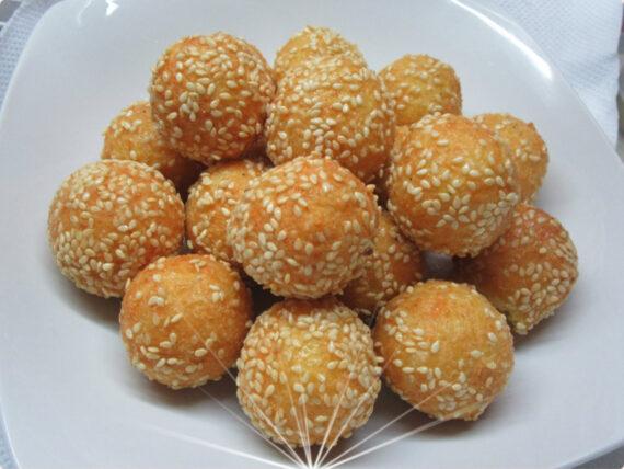 Στην συνέχεια πλάθουμε σε μπαλίτσες το μείγμα. Την κάθε μπαλίτσα την ρολάρουμε στο σουσάμι και τηγανίζουμε σε βαθύ σκεύος, σε μπόλικο αραβοσιτέλαιο μέχρι να ροδίσουν.