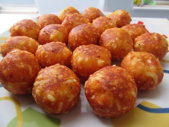 Μια πατάτα βρασμένη 1 κούπα τυρί γκούντα 1 κούπα τυρί ρεγκάτο 1 κούπα τυρί έμενταλ 2 ασπράδια αυγών 3 κουταλιές σούπας αλεύρι λίγο πιπέρι ΕΚΤΕΛΕΣΗ