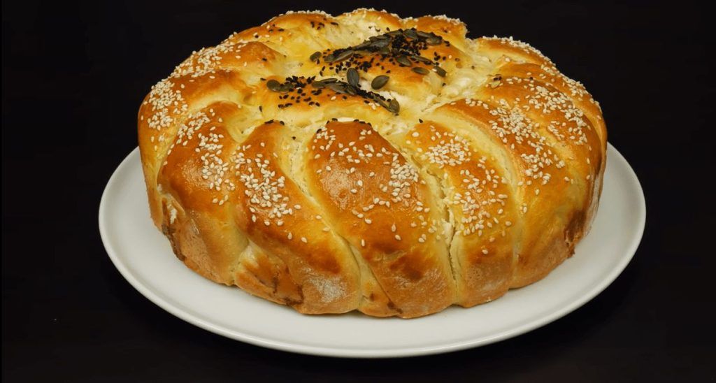Approximately 800 g of flour 1 sachet of dry yeast 2 eggs 300 ml of milk 200 ml yoghurt 30 ml of seed oil 1 tablespoon of sugar A little salt 200 g cream cheese 200 g Feta