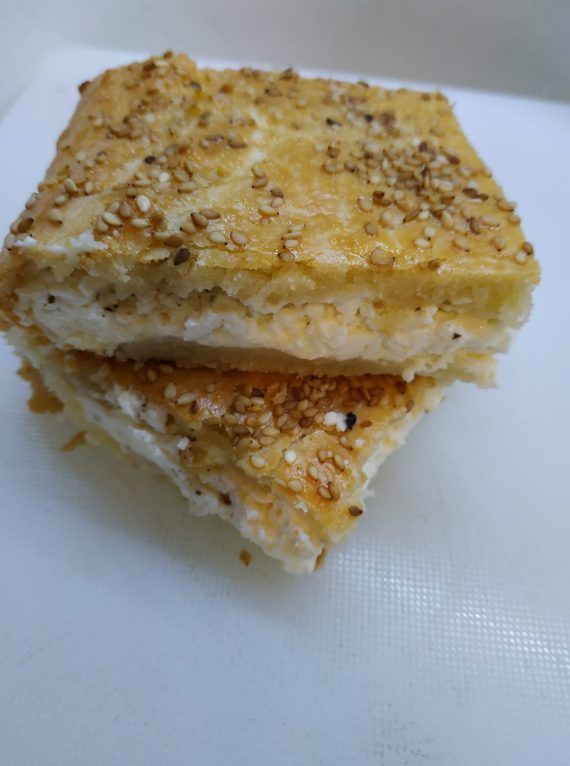 Τα ρίχνουμε πάνω στο τυρί κλείνουμε με το άλλο φύλλο και αλείφουμε με αυγό και σουσάμι. Ψήνουμε μέχρι να ροδίσει σε αντιστάσεις στους 180 βαθμούς.
