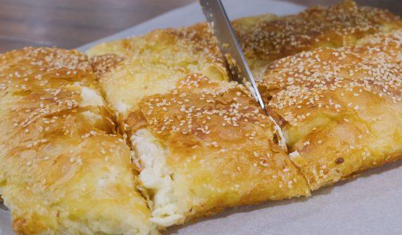 ZUTATEN 500 g griechischer Feta-Käse 500 g Phyllo 2 mittelgroße Eier 300 g Milch 1 TL Backpulver ————————————- 100 g Wasser 50 g Olivenöl 1 TL Salz ————————————– Sesam