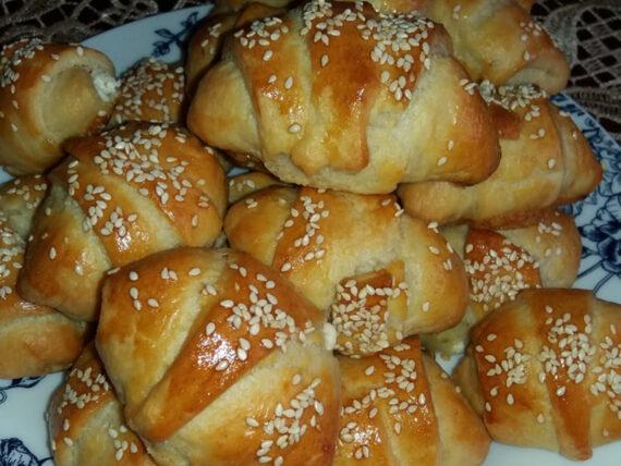 Σκεπάζουμε τη ζύμη και την αφήνουμε για περίπου 1 ώρα να φουσκώσει σε ζεστό μέρος. Έπειτα την χωρίζουμε σε δύο μπάλες και κόβουμε τη κάθε μπάλα σε τριγωνάκια, σαν να κόβουμε πίτσα. Θρυμματίζουμε με τα χέρια τη φέτα και γεμίζουμε κάθε άκρη στο τριγωνάκι με φέτα και ρολάρουμε.