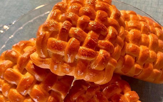 Έπειτα χωρίζουμε την ζύμη σε 10 μπαλάκια. Ανοίγουμε το κάθε μπαλάκι σε τετράγωνο φύλλο. Με ένα καλαμάκι για σουβλάκι κάνουμε ένα σταυρό πάνω στο φύλλο. Χαράζουμε το πάνω αριστερά και το κάτω δεξιά φύλλο, σαν λωρίδες και βάζουμε γέμιση στο πάνω δεξιά και στο κάτω αριστερά μέρος του φύλλου. Κλείνουμε το πάνω δεξιά με το κάτω αριστερά και στη συνέχεια πλέξουμε με τις λωρίδες.
