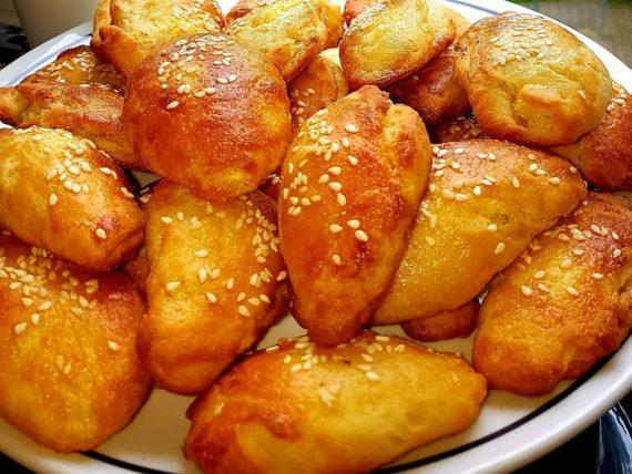 Βάζουμε μέσα λίγη θρυμματισμένη φέτα και το κλείνουμε σαν μπαλάκι. Στην συνέχεια του δίνουμε σχήμα σαν τυρόπιτα ή τυροπιτάκια. Το βάζουμε σε ένα ταψί με λαδόκολλα. Τα αλείφουμε με κρόκο αυγού που τον έχουμε αραιώσει σε λίγο νερό και τα πασπαλίζουμε με σουσάμι. Τα ψήνουμε στους 190-200 βαθμούς Κελσίου μέχρι να πάρουν χρώμα.
