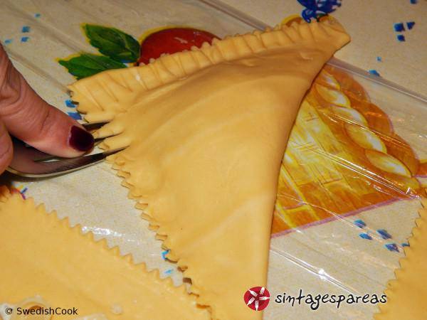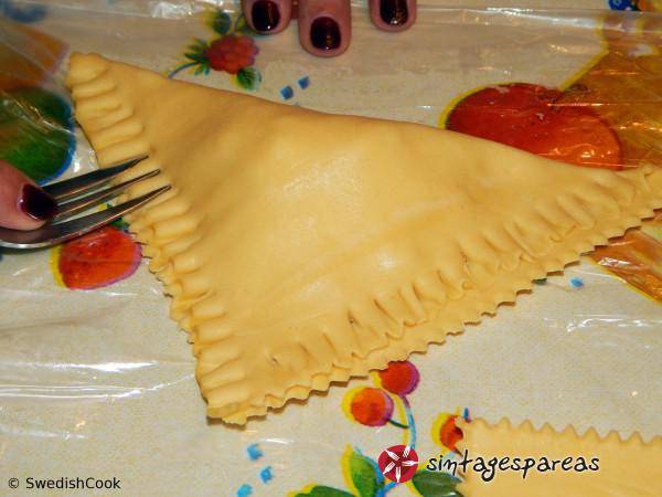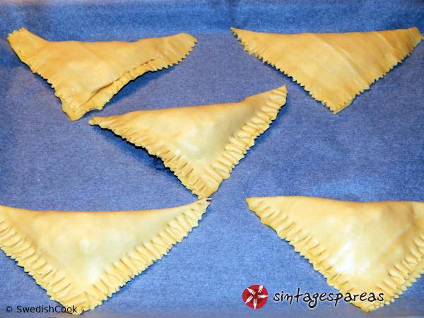 Προσεκτικά, ξεχωρίζουμε κάθε τυρόπιτα και την κλείνουμε σε τρίγωνο.