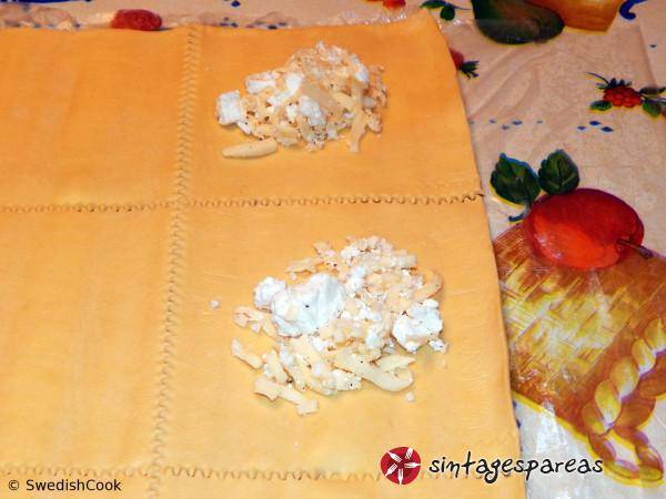 Βάζουμε μια κουταλιά της σούπας γέμιση στο κέντρο κάθε τετραγώνου.