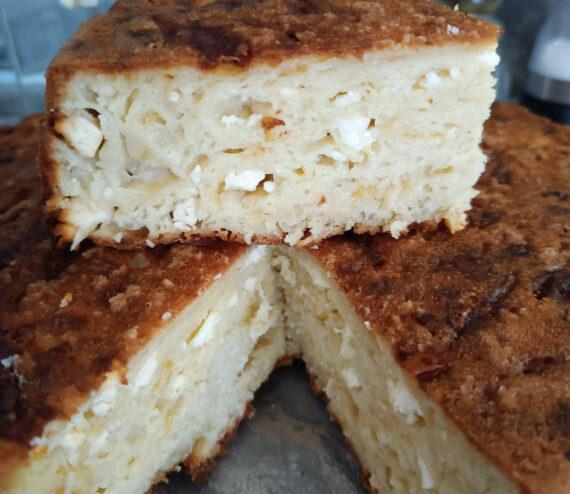Σταματάμε να προσθέτουμε νερό όταν πάρουμε έναν παχύρρευστο χυλό. Αφήνουμε τον χυλό στην άκρη για μισή και μετά την μισή ώρα προσθέτουμε την θρυμματισμένη φέτα και το τριμμένο ρεγκάτο. Ψήνουμε στους 180 βαθμούς Κελσίου για 50 λεπτά περίπου.