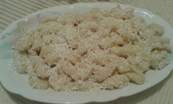 Εκτέλεση Σε μια λεκάνη ρίχνετε το αλεύρι , κάνετε μια γούβα και ρίχνετε την μαγιά , την ζάχαρη, το αλάτι, το λάδι, το ξύδι και 2 ποτήρια νερό ζεστό. Ζυμώνετε πολύ καλά και προσθέτετε και άλλο νερό σιγά – σιγά μέχρι να έχετε μια ζύμη μαλακή που δεν κολλάει στα χέρια. Σκεπάζετε με μεμβράνη και με πετσέτα και αφήνετε σε ζεστό μέρος για 45 λεπτά. Κατόπιν αδειάζετε το ζυμάρι στο τραπέζι και κόβετε μικρά μπαλάκια σε μέγεθος μεγάλου καρυδιού. Ραντίζετε με αλεύρι το τραπέζι ή τον πάγκο και κάνετε το μπαλάκι ένα μεγάλο κορδόνι σε πάχος μικρού δαχτύλου και αφήνετε στην άκρη. Όταν κάνετε αρκετά κορδόνια τα κόβετε μικρά κομμάτια σε μέγεθος 1 εκ. Παίρνετε ένα ξύλο κοπής βάζετε τα κομμάτια στο ξύλο τα βάζετε κάθετα και τα πιέζετε με το δάχτυλό σας από πάνω προς τα κάτω να έρθουν να γυρίσουν. Τα ρίχνετε επάνω σε αλεύρι να μην κολλήσουν. Σε αυτήν την φάση τα κάνετε με 2 τρόπους.