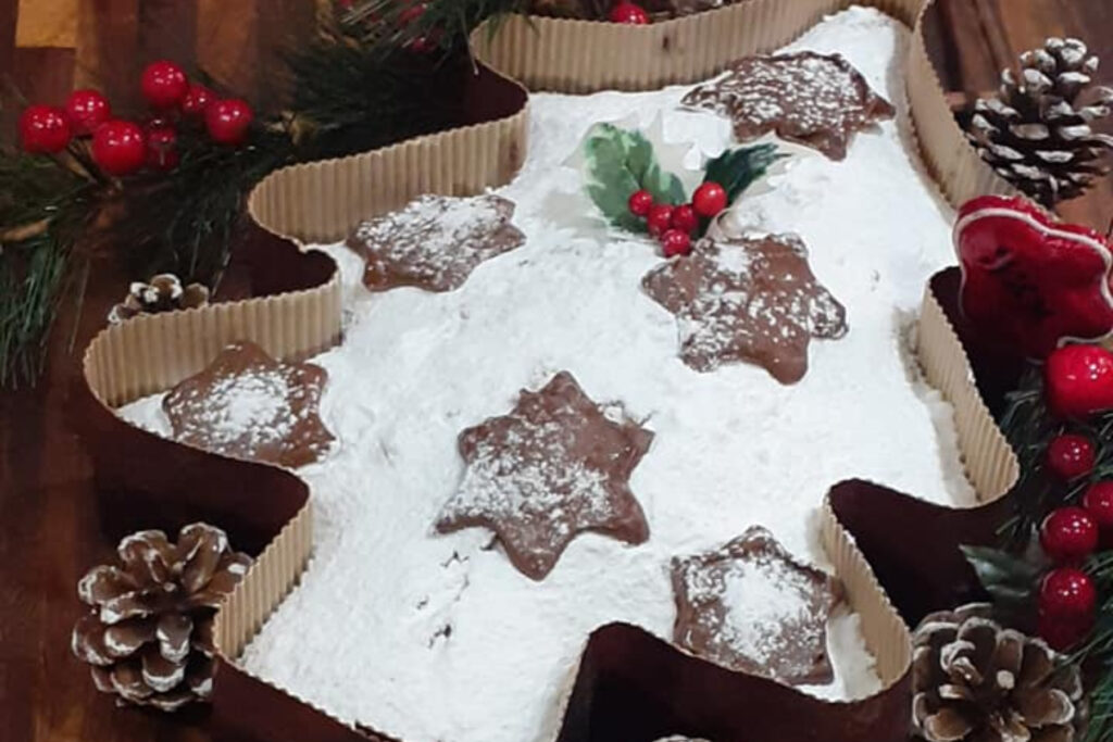 Αφού ομογενοποιηθεί το μείγμα παίρνουμε ένα Χριστουγεννιάτικο ταψί σε σχήμα δέντρου και το πασπαλίζουμε με τριμμένη φρυγανιά. Μεταφέρουμε εκεί το μείγμα και ψήνουμε στους 190 βαθμούς Κελσίου για 40-50 λεπτά, μέχρι να ροδίσει καλά. Αφού ψηθεί την αφήνουμε να κρυώσει και την βγάζουμε το το ταψί. Πασπαλίζουμε με ζάχαρη άχνη και είναι έτοιμη. Σας άρεσε αυτή η συνταγή; Πείτε μας την γνώμη σας στα σχόλια.