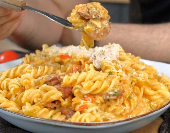 Δείτε παρακάτω την εκτέλεση για τις βίδες με φέτα λουκάνικα και πιπεριές: