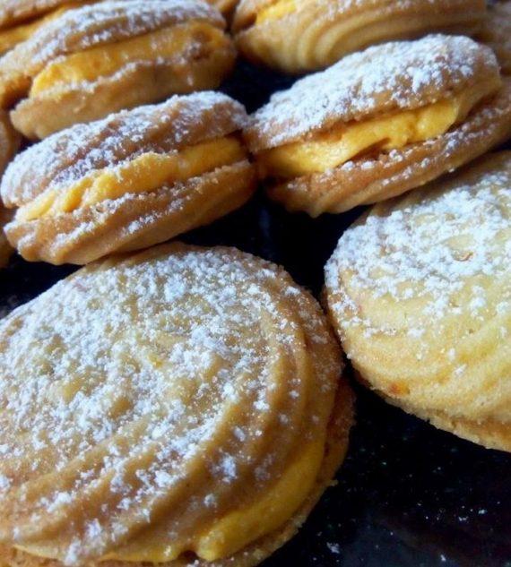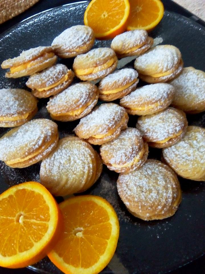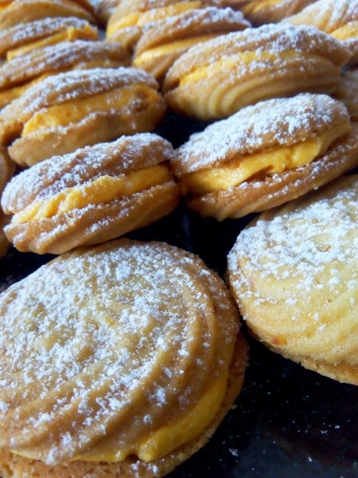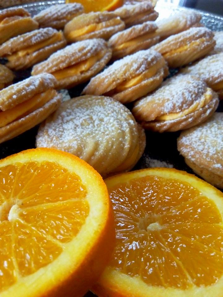 Για την ζύμη: 1&1\2 φλιτζάνι φαρίνα 220 γρ. Βούτυρο 1\2 φλιτζάνι άχνη ζάχαρη 1κ.σ. κορν φλαουρ 2κ.σ. ξύσμα πορτοκαλιού Για την γέμιση: 60γρ. Βούτυρο 1 φλιτζάνι άχνη ζάχαρη 3κ.σ. χυμό πορτοκαλιού 1 βανίλια 2 σταγόνες Χρώμα ζαχαροπλαστικής πορτοκάλι. Εκτέλεση: Χτυπάς το βούτυρο με την άχνη και το ξύσμα να αφρατεψη, ανακατεύουμε τη φαρίνα με το κορν φλαουρ και το ρίχνουμε στο μίγμα με το βούτυρο.. να γίνουν ένα ομοιογενές μείγμα.. το βάζουμε σε ένα κόρνερ και κάνουμε ροζέτες σε ένα ταψί το οποίο έχουμε βουτυροση… Ψήνουμε στον αέρα 180′ για 10′ λεπτά.. τα αφήνουμε να κρυώσουν… Για την γέμιση: Χτυπάμε το βούτυρο με την άχνη ζάχαρη το χυμό πορτοκαλιού την βανίλια και το χρώμα.. γεμίζουμε τα μπισκότα και τα πασπαλίζουμε με άχνη ζάχαρη!!!!!!!!!