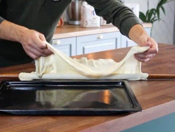 Βάζουμε τα δύο πιάτα στο ψυγείο για 30′. Ανοίγουμε τη ζύμη κάθε πιάτου με ένα μεγάλο, λεπτό πλάστη σε όσο πιο λεπτό φύλλο μπορούμε (ΔΕΝ ΑΛΕΥΡΩΝΟΜΥΕ). Αλείφουμε ένα ταψί κουζίνας με φυτίνη και απλώνουμε μέσα το ένα φύλλο.