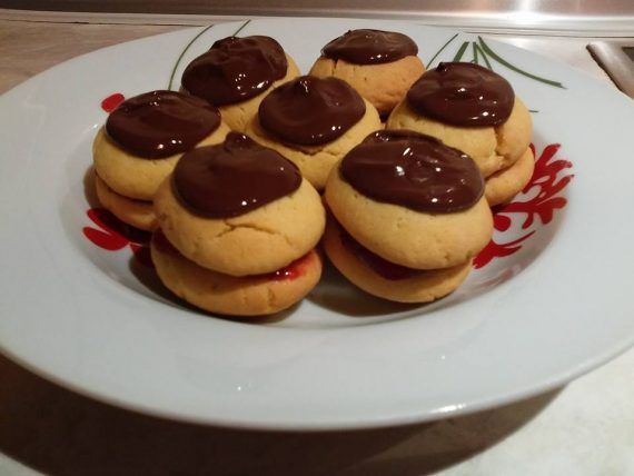 Σε μία λεκάνη χτυπάμε καλά τα αυγά και την ζάχαρη και προσθέτουμε τα υπόλοιπα υλικά εκτός απο το αλεύρι.Ανακατεύουμε ελαφρά και σιγά σιγά ρίχνουμε το αλεύρι κοσκινησμενο μέχρι να φτιάξουμε μία εύπλαστη ζύμη.Πλάθουμε όπως τα μπιφτέκια και ψήνουμε στους 180βαθμούς σε αέρα για περίπου 25 λεπτά.Αφού ψηθούν και κρυώσουν,με ένα κουταλάκι βάζουμε μαρμελάδα στο κάτω μέρος του μπισκότου και ενώνουμε με το άλλο μπισκότο. Αφού λιώνουμε την σοκολάτα απλώνουμε πάνω από όλα τα μπισκότα και σερβίρουμε!Όπως σάς δείχνω είναι υπέροχα και μόνο με σοκολάτα! ΚΑΛΗ ΕΠΙΤΥΧΙΑ ΧΡΙΣΤΙΑΝΟΣ ΓΙΩΡΓΟΣ ΣΕΛΙΔΑ ΜΑΓΕΙΡΙΚΗΣ