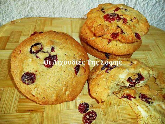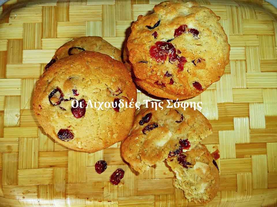 ΥΛΙΚΑ 250 γρ.βούτυρο αγελαδινό λιωμένο 180 γρ.ζάχαρη 2 αυγά 400-450 γρ.αλεύρι γ.ο.χ 180 γρ.νιφάδες βρώμης 2 βανίλιες 2 κ.γ μπέικιν 1 πρέζα κανέλα 1 πρέζα γαρίφαλο τριμμένο 1 πρέζα αλάτι 200 γρ.λευκή σοκολάτα σε μικρά κομματάκια 200 γρ.αποξηραμένα κράνμπερι ή σταφίδες ή όποιο άλλο αποξηραμένο φρούτο