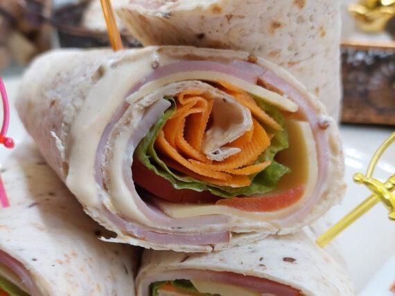 Παίρνουμε τις τορτίγιες με λιναρόσπορο και σπόρους Chia και στρώνουμε στην καθεμία από μία στρώση σώς γιαουρτιού, μία φέτα γαλοπούλα βραστή, μία φέτα μπριζόλα καπνιστή, μία φέτα κασέρι, 1-2 φέτες ντομάτα, 1 φύλλο μαρούλι και λίγο καρότο σε φλούδες. Ρολάρουμε και είναι έτοιμη.