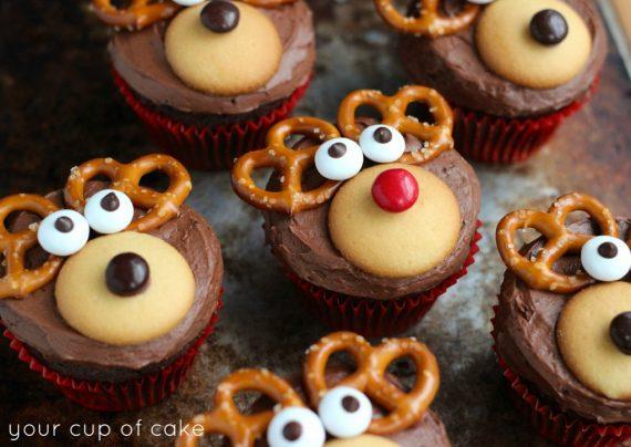 1. Προθερμάνετε το φούρνο στους 176 βαθμούς Κελσίου και προετοιμάστε και το ταψί με τις θήκες για τα cupcakes. 2. Ανακατέψτε το μείγμα του κέικ σε ένα μικρό μπολ και αφήστε το στην άκρη. 3. Σε ένα μεγάλο μπολ, ανακατέψτε τα αυγά, το λάδι, το εκχύλισμα βανίλιας, το γάλα και την ξινή κρέμα μέχρι να αφρατέψουν. 4. Ανακατέψτε το μείγμα του κέικ. 5. Γεμίστε τις φόρμες για κέικ στα 3/4 αφήστε τα να ψηθούν για 16-20 λεπτά ή μέχρι να βγαίνει καθαρό το μαχαίρι ή οδοντογλυφίδα. 6. Αφήστε τα να κρυώσουν. 7. Frosting σοκολάτας: Βάλτε βούτυρο. Προσθέστε τη σκόνη κακάο, τις 2 κούπες με την άχνη ζάχαρη και το γάλα. Προσθέστε αργά περισσότερη άχνη ζάχαρη μέχρι να φτάσετε στο επιθυμητό αποτέλεσμα. 8. Προετοιμασία ταράνδων χρησιμοποιήστε το Frosting για να κολλήσετε τα καφέ M & M και τα μπισκοτάκια. Λιώστε μερικά κουφετάκια σοκολάτας, βάλτε τα σε ένα μικρό πλαστικό σακουλάκι, κόψτε την άκρη για να φτιάξουμε ένα μίνι κορνέ ζαχαροπλαστικής για να φτιάξετε τα μικρά μάτια στα λευκά M & M. 9. Διακόσμηση: 10. (Βλ. Φωτογραφίες παρακάτω) Τοποθετήστε τα μικρά μπισκοτάκια ως μουσούδες με τα M & M στα cupcakes, και στη συνέχεια τοποθετήστε τα pretzels πιο πάνω. Χρησιμοποιήστε λίγο γλάσο για να κολλήσετε τα 2 μάτια και τα cupcakes σας είναι έτοιμα!