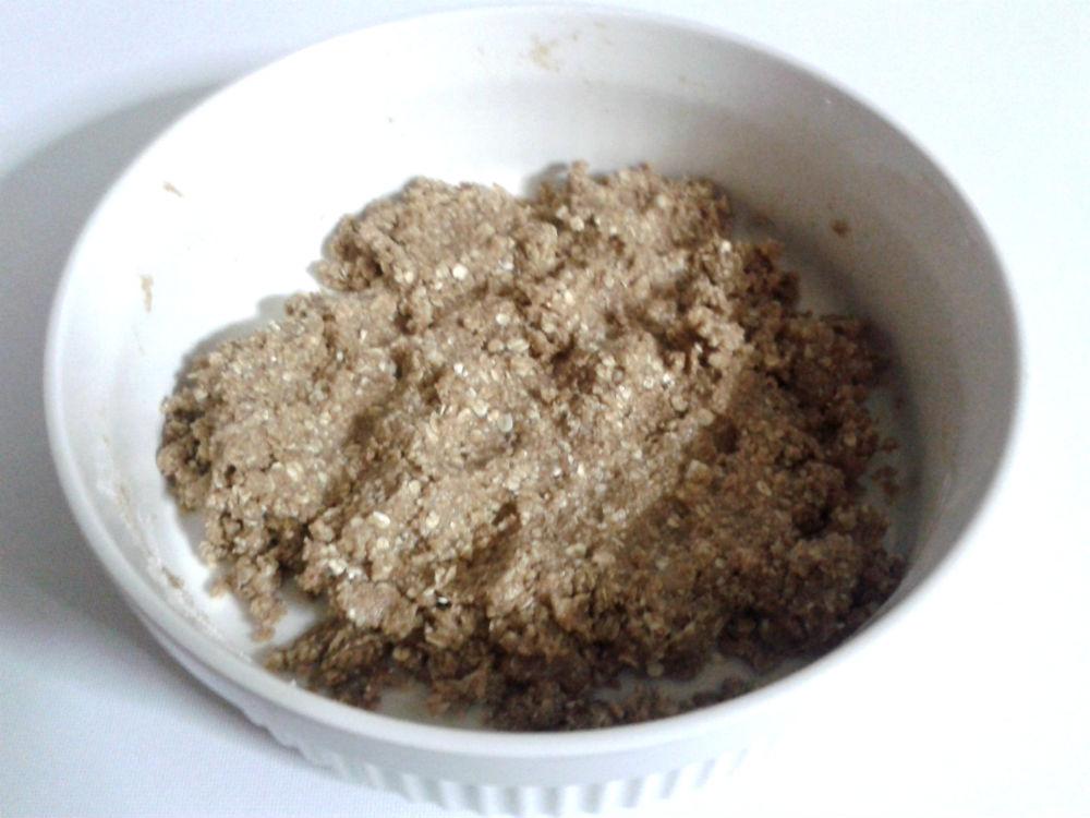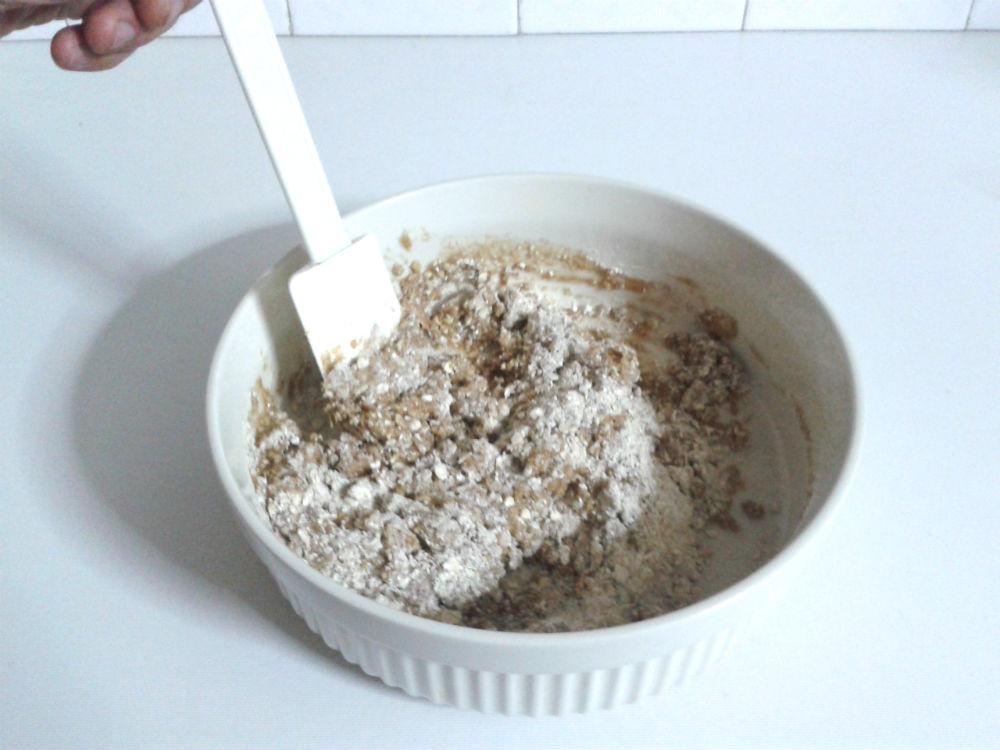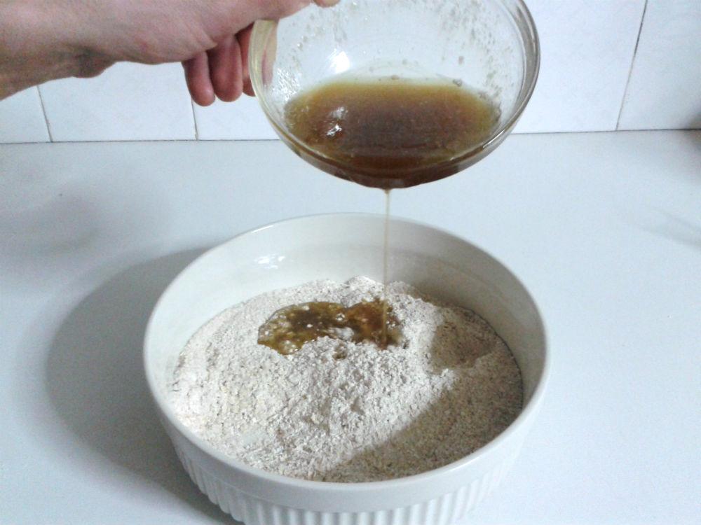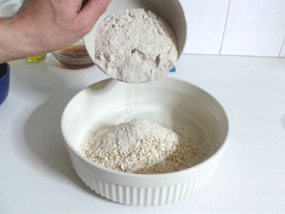Στη συνέχεια αδειάζουμε στο ίδιο μπoλ το μέλι, το βούτυρο και το ελαιόλαδο. Τα ζεσταίνουμε για 1 λεπτό στο φούρνο μικροκυμάτων. Ανακατεύουμε ελαφρά μέχρι να γίνει ένα ομοιογενές μείγμα. Αδειάζουμε το περιεχόμενο στο προηγούμενο μείγμα με το κουάκερ και το αλεύρι, το ανακατεύουμε και ξεκινάμε να το πλάθουμε.