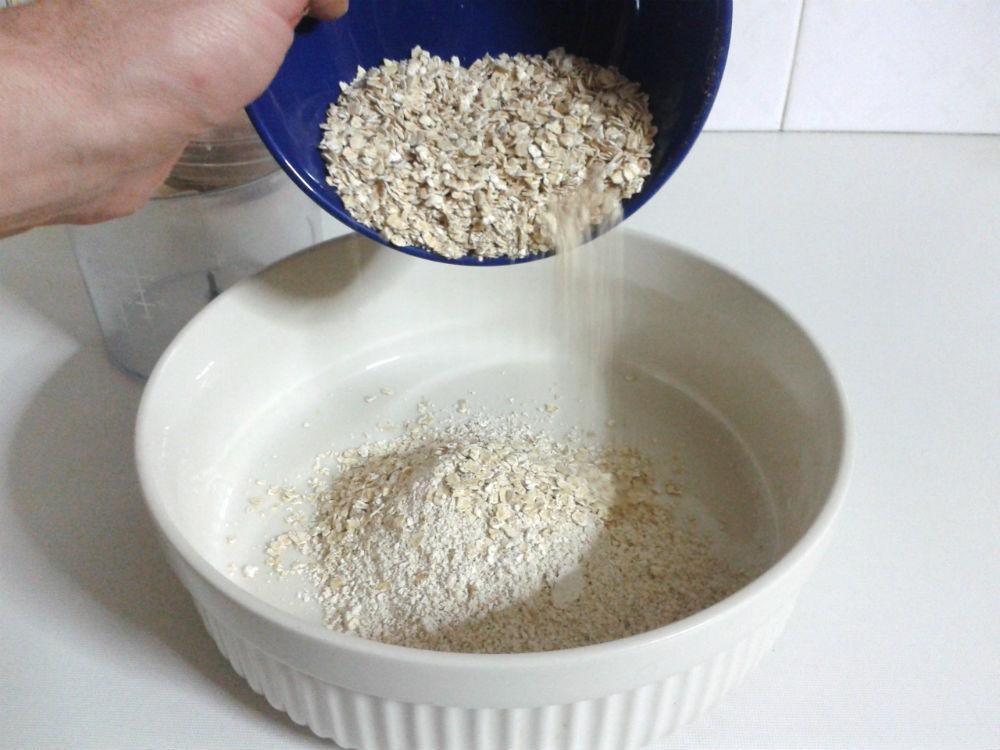 Χτυπάμε στο μούλτι τα 75 γρ. κουάκερ μέχρι να γίνουν σκόνη και στη συνέχεια τα αδειάζουμε σε ένα μπολ. Στη συνεχεία ρίχνουμε τα υπόλοιπα κουάκερ και αδειάζουμε στο ίδιο μπολ το αλεύρι και το μπέικιν πάουντερ.