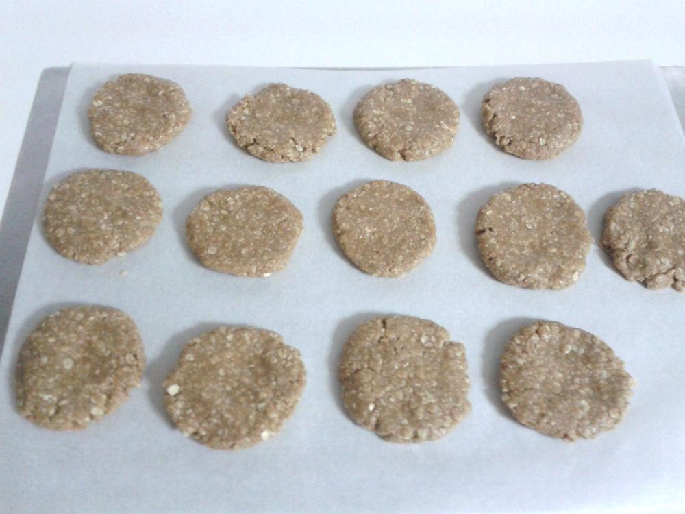 Πλάθουμε μπισκότα σε οποίο μέγεθος και σχήμα θέλουμε απλά όχι πολύ χοντρά σε πάχος για να ψηθούν. Τα ψήνουμε στους 175 βαθμούς Κελσίου για 10 με 15 λεπτά μέχρι να ροδίσουν. Μπορούμε αν θέλουμε να προσθέσουμε σοκολάτα. Κόβουμε την σοκολάτα σε μικρά κομμάτια και την προσθέτουμε στο μείγμα.
