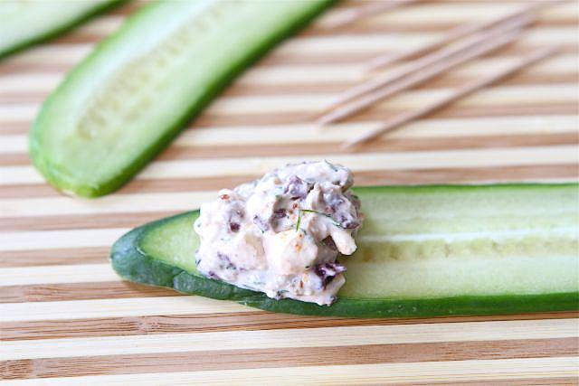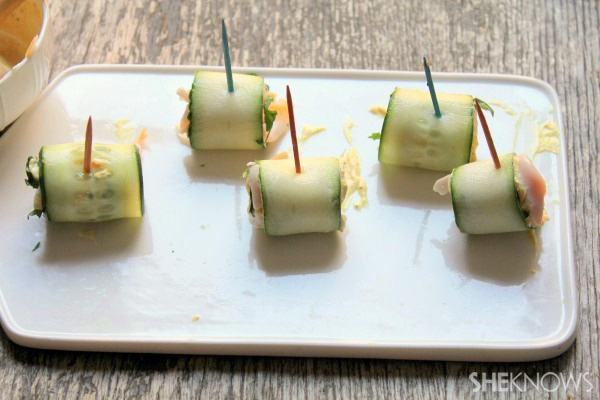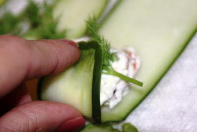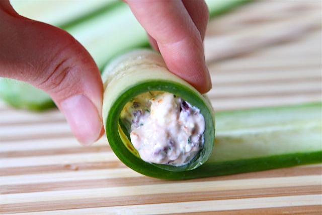 Τοποθετήστε μια λωρίδα αγγούρι σε ένα πιάτο και γεμίστε με ένα κουταλάκι του γλυκού από το μίγμα φέτας επάνω σε κάθε άκρο της λωρίδας αγγουριού. Τυλίξτε το αγγούρι και στερεώστε το με μια οδοντογλυφίδα. Παγώστε μέχρι να είστε έτοιμοι να σερβίρετε.
