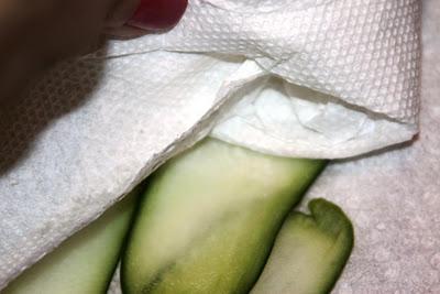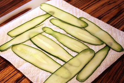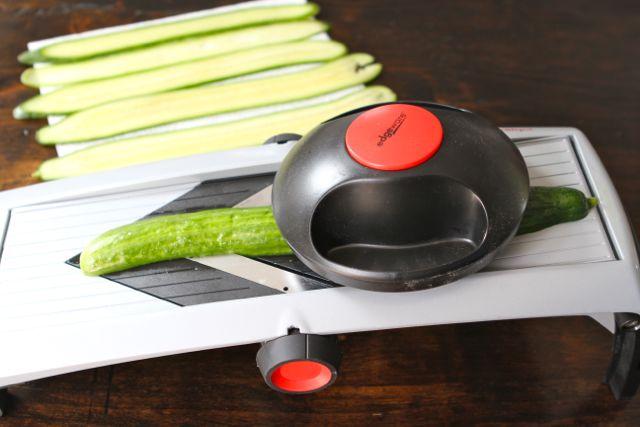 Ξεκινήστε κόβοντας το αγγούρι στη μέση κατά μήκος. Στη συνέχεια, χρησιμοποιώντας ένα μαντολίνο (ή ένα αποφλοιωτή λαχανικών), κόψτε το αγγούρι κατά μήκος σε μακρόστενες λωρίδες. Τοποθετήστε τις φέτες αγγουριού σε μια πετσέτα κουζίνας για να απορροφηθούν τα υγρά.