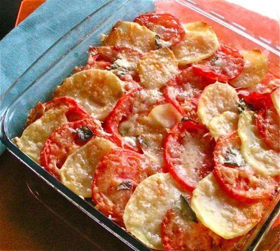 2 μεγάλα κόκκινα ή άσπρα κρεμμύδια, κομμένα σε λεπτές φέτες 1 κιλό πατάτες, καθαρισμένες και κομμένες σε λεπτές ροδέλες 450-500 γραμ. ντομάτες, σε ροδέλες με τα ζουμιά τους 8-10 κ.σ. ελαιόλαδο 1 φλυτζ. φρεσκοτριμμένη παρμεζάνα ή πεκορίνο ή πικάντικο τσένταρ (Cheddar) αλάτι, φρεσκοτριμμένο πιπέρι μερικά φύλλα βασιλικού 1/4 φλυτζ. νερό