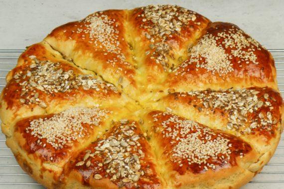 Πατάμε με τα δάχτυλα μας τις άκρες και δίνουν σχήμα. Αλείφουμε με έναν κρόκο αυγού και αν θέλουμε πασπαλίζουμε την πίτα μας με σπόρους και σουσάμι. Ψήνουμε την πίτα μας στους 180 βαθμούς Κελσίου μέχρι να ροδίσει.