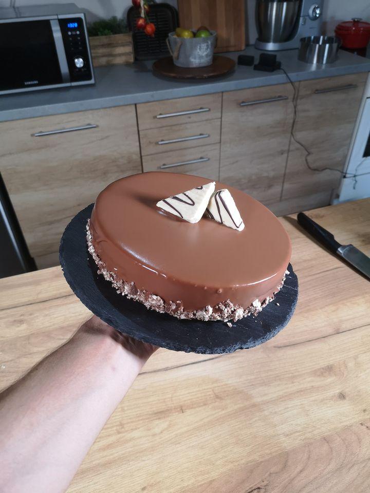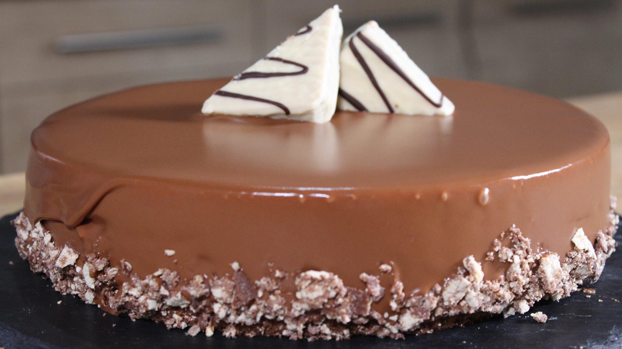 Βγάζουμε την τούρτα από την κατάψυξη και περιχύνουμε από πάνω το μείγμα με την κρέμα σοκοφρέτας. Το απλώνουμε να πάει παντού. Με τα χέρια προσθέτουμε περιμετρικά στον πάτο της τούρτας την θρυμματισμένη σοκοφρέτα.