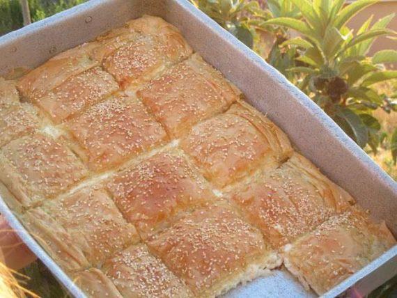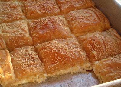 Αυτήν εδώ την έκανα με φύλλα Βηρυτού έβαλα 4 φύλλα κάτω κάτω ενώ βουτύρωνα το καθένα..έβαλα την γέμιση κ πάνω έβαλα τα υπόλοιπα φύλλα ένα ένα κ βουτυρωμένα …Χαράκωσα ελαφρά πασπάλισα με σουσάμι κ νερό!!!