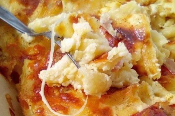 Σε ένα λαδωμένο ταψί ρίχνουμε δύο βαθιές κουταλιές κρέμα. Αδειάζουμε στην συνέχεια τα ζυμαρικά και προσθέτουμε επίσης το ζαμπόν και τα τυριά. Ανακατεύουμε για να πάνε τα υλικά μας παντού. Προσθέτουμε την υπόλοιπη κρέμα και πασπαλίζουμε με το υπόλοιπο τυρί.