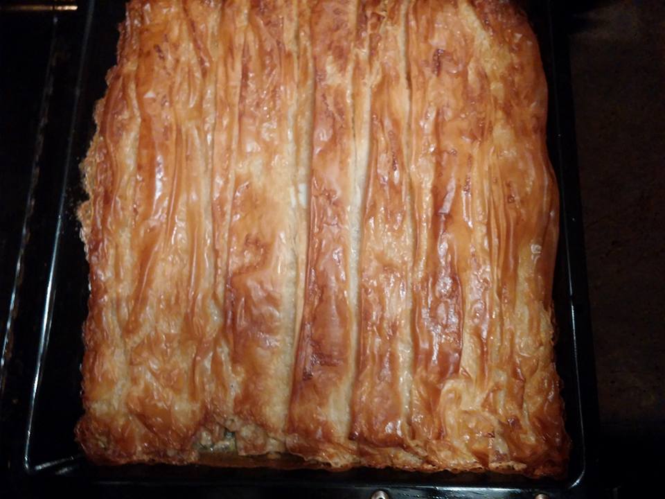 Παίρνουμε ένα φύλλο κρούστας το βουτυρωνουμε και το σουρώνουμε πιάνοντάς το από τη μακριά του πλευρά, ώστε να γίνει πλισέ! Το βάζουμε μέσα στο ταψι του φουρνου!