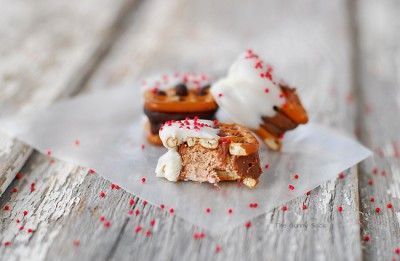 Λιώνουμε σε μπεν μαρή την λευκή κουβερτούρα και τα βουτάμε από την μία πλευρά μέσα.