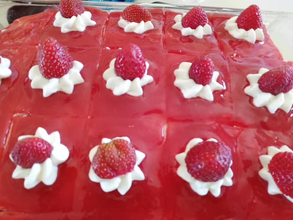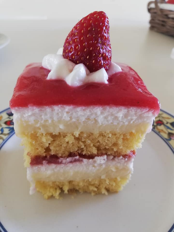 Παντεσπάνι, το σιροπιασα ελαφρά. Έπειτα την κρέμα, σαντιγί, σάλτσα φράουλας, ξανά παντεσπάνι κρέμα σαντιγί και από πάνω την υπόλοιπη σάλτσα φράουλας. Έκανα ροζετες με σαντιγί και από πάνω έβαλα φρέσκες φράουλες.