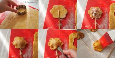 Γενικά οι επιφάνειες που θα ακουμπήσουν την ζύμη όσο δουλεύετε τα λουλουδάκια, καλό είναι να είναι ελαφρώς αλευρωμένες για να μην σαν κολλήσουν. Χρησιμοποίησα μεσαία ξυλάκια για σουβλάκια. Την αιχμηρή άκρη την έντυσα με λίγο σελοτειπ και στην συνέχεια κόλλησα με κόλα χαρτιού λωρίδες εφημερίδας στην άκρη. Η φίλη μου η Εφη μου το θύμισε, εγώ τα ξυλάκια τα μούλιασα στο νερό για 15 λεπτά πριν τα χρησιμοποιήσω. Νομίζω ότι ο χρόνος που ψήνονται έτσι κ αλλιώς είναι λίγος για να μαυρίσουν αλλά αν θέλετε τα μουλιάζετε για λίγο πριν τα χρησιμοποιήσετε.