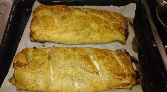 1 πακέτο φύλλα σφολιάτας 1 τυρί κρέμα Philadelphia 12 φέτες ζαμπόν 12 φέτες μπέικον 300 γρ. τυρί τριμμένο gouda 1 αυγό Σουσάμι Λίγο γάλα.