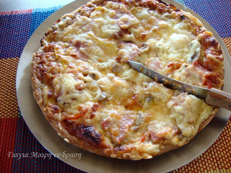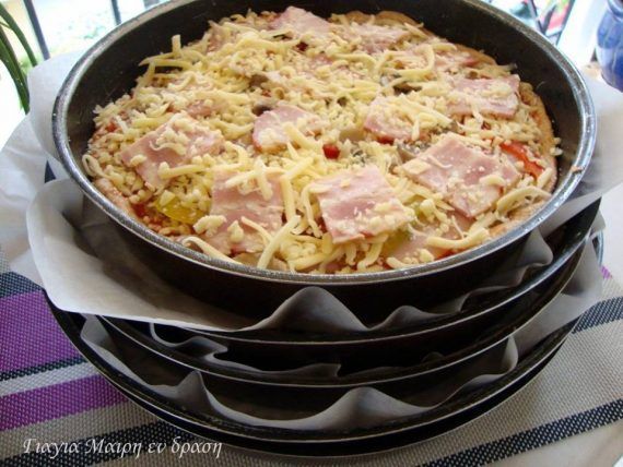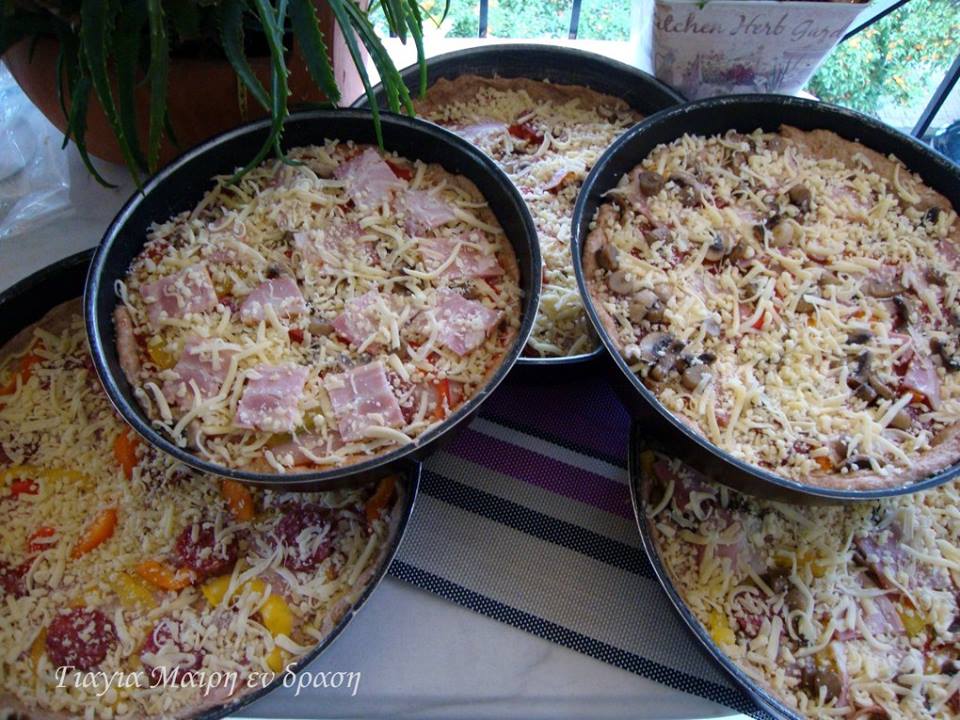 Υλικά 2 κιλά αλεύρι ολικής 3 κύβους νωπή μαγιά η’ 3 φακελάκια ξερή 3 κγ ζάχαρη 3 κγ αλάτι 5 κσ σπορέλαιο νερο οσο παρει περιπου ενα λιτρο χλιαρο μπέικον ζαμπόν κέτσαπ πιπεριές σε μικρά κυβάκια μανιτάρια σοταρισμένα με λίγο βούτυρο να είναι μαλακά σουτζούκι αν θέλετε κίτρινα τυριά τριμμένα οι ποσότητες είναι καθαρά θέμα της κάθε νοικοκυράς εκτέλεση σε χλιαρό νερό λιώνουμε την μάγια ρίχνουμε την ζάχαρη το αλατι και το σπορέλαιο και περίπου 2 κιλά αλεύρι και ζυμώνουμε μέχρι να εχουμε μια απαλή ζύμη να μην κολλάει όμως στα χέρια μας! ανοίγουμε 6 χοντρά φύλλα και τα μοιράζουμε σε 6 μέτρια ταψάκια που έχετε λαδώσει ελαφριά και βάζουμε 4-5 κσ κέτσαπ στην συνέχεια τα αλλαντικά τα μανιτάρια τις πιπεριές και τέλος τα τυριά και κόβουμε λαδόκολλα λίγο μεγαλύτερες από το ταψί μας και σκεπάζουμε τις πίτσες μια μια και τις βάζουμε την μια πάνω στην άλλη και όλες μαζί τα ταψάκια σε μια μεγάλη σακούλα τροφίμων η’ τις τυλίγεται με μεμβράνη και τις αφήνεται στην κατάψυξη για πάνω από 6 μήνες! όταν θέλετε να ψήσετε μια πίτσα την βγαζετε μια ώρα πριν και μετά την ψήνετε για 30 με 40 λεπτά στους 180 πάνω κάτω!!!!
