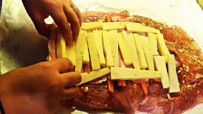 2 κιλό μπούτι χοιρινό χωρίς κόκκαλο 150 γρ. κεφαλογραβιέρα 150 γρ. γκούντα 4-5 φέτες μπέικον 2 καρότα 2 σκελίδες σκόρδο Αλάτι και πιπέρι Κόκκινο πιπέρι ρίγανη