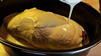 Το αλατοπιπερώνουμε και Βάζουμε το ρολό στην γάστρα και πάμε να φτιάξουμε την σάλτσα μας. Στο μούλτι ρίχνουμε όλα τα υλικά της σάλτσας και το δουλεύουμε μέχρι να ομογενοποιηθούν τα υλικά μας. Περιχύνουμε το ρολό με την πλούσια σάλτσα και το ψήνουμε για περίπου 2 ώρες. Στην μία ώρα περίπου το βγάζουμε και το ελέγχουμε. Παίρνουμε από την σάλτσα που είναι στη γάστρα και ρίχνουμε πάνω στο ρολό και το γυρίζω από την ανάποδη πλευρά και πάλι ρίχνω επάνω του σάλτσα.