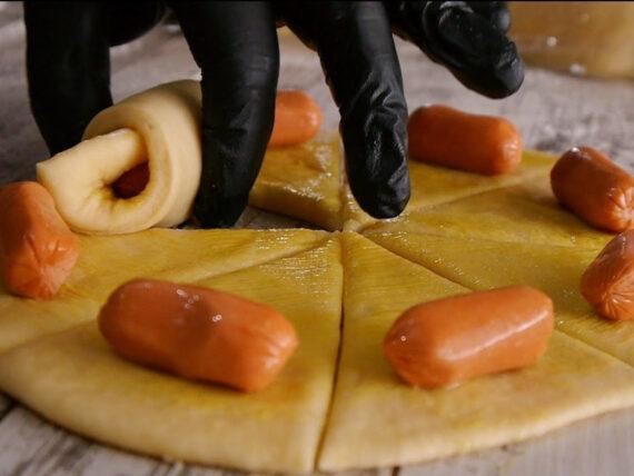Έπειτα κόβουμε την ζύμη στα 4 και ανοίγουμε το κάθε μπαλάκι σε στρόγγυλο σχήμα. Προσθέτουμε αν θέλουμε μουστάρδα η αφήνουμε σκέτο το ζυμάρι μας. Στην συνέχεια βάζουμε γύρω γύρω τα λουκάνικά μας και κόβουμε τριγωνικά εκεί που υπάρχει το κάθε λουκάνικο.