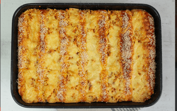 Έπειτα με τα δάχτυλά μας κάνουμε αυλάκια στην ζύμη και τα γεμίζουμε με το κοτόπουλο. Αλείφουμε την ζύμη με κρόκο αυγού και πασπαλίζουμε με σουσάμι. Απλώνουμε τριμμένο τυρί πάνω από το κοτόπουλο και ψήνουμε στους 180 βαθμούς Κελσίου, στις αντιστάσεις μέχρι να ροδίσει.