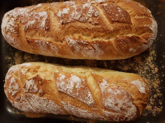 Ψήνουμε για μισή ώρα περίπου και είμαστε έτοιμοι. Έχουμε το δικό μας ψωμάκι σε μιάμιση ώρα και ζυγισμένο 370 γρ το κάθε καρβέλι. Μπορούμε επίσης να προσθέσουμε σε κάθε καρβέλι ελιές ρίγανη ή τυρί. Γίνεται εξίσου νόστιμο αν βάλετε μόνο αλεύρι για όλες τις χρήσεις (550γρ).